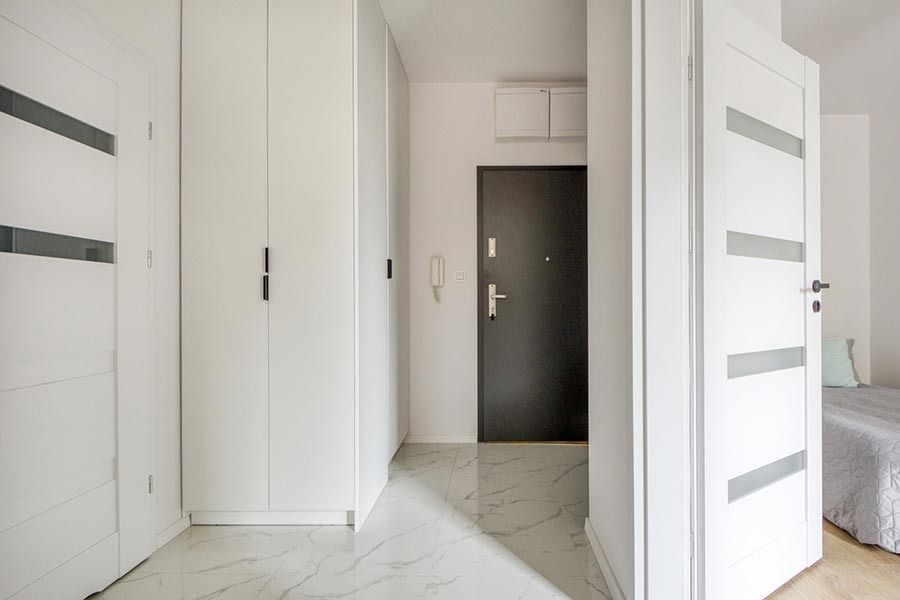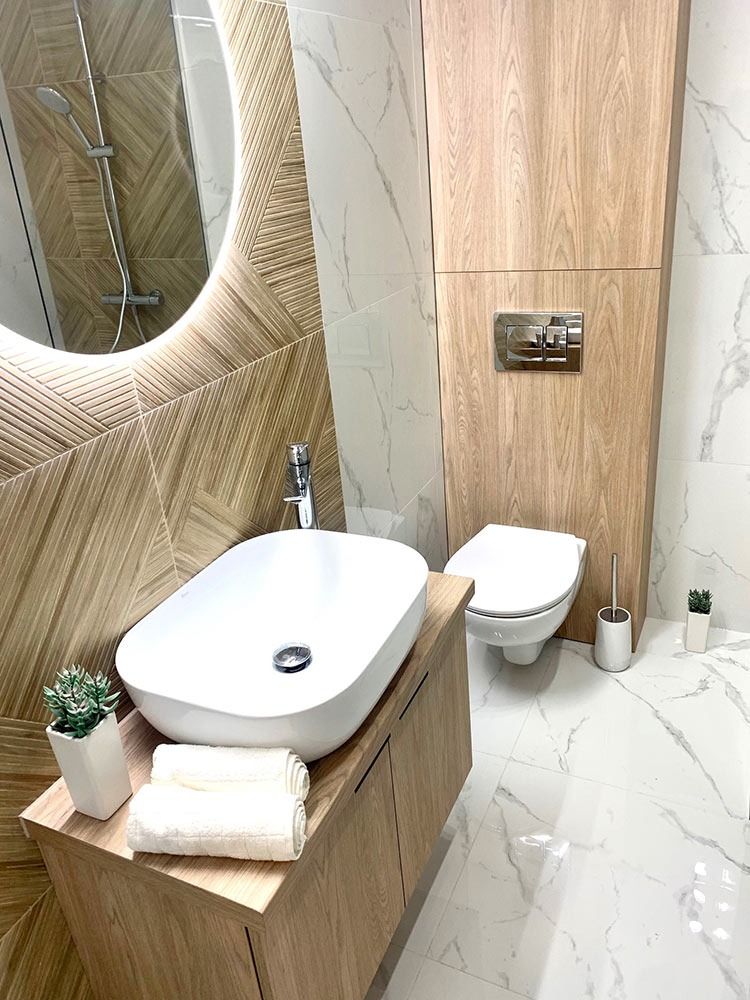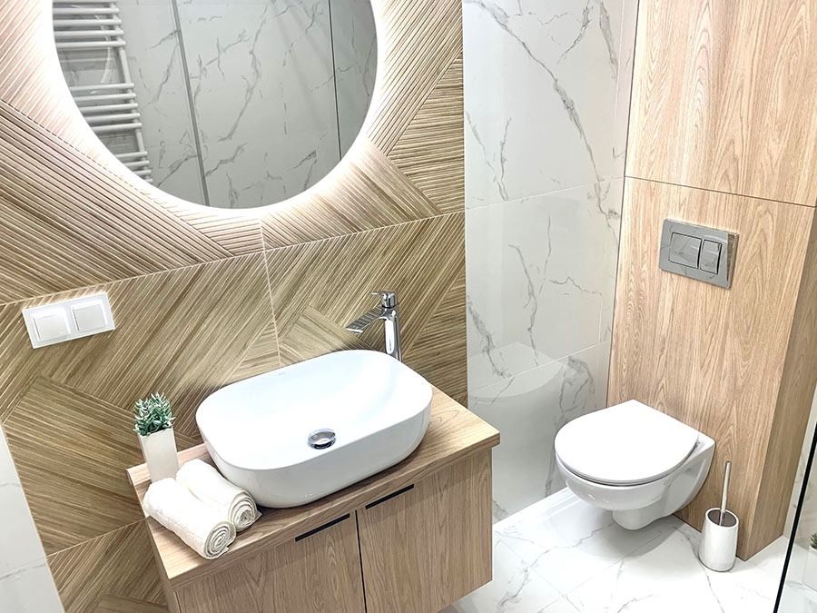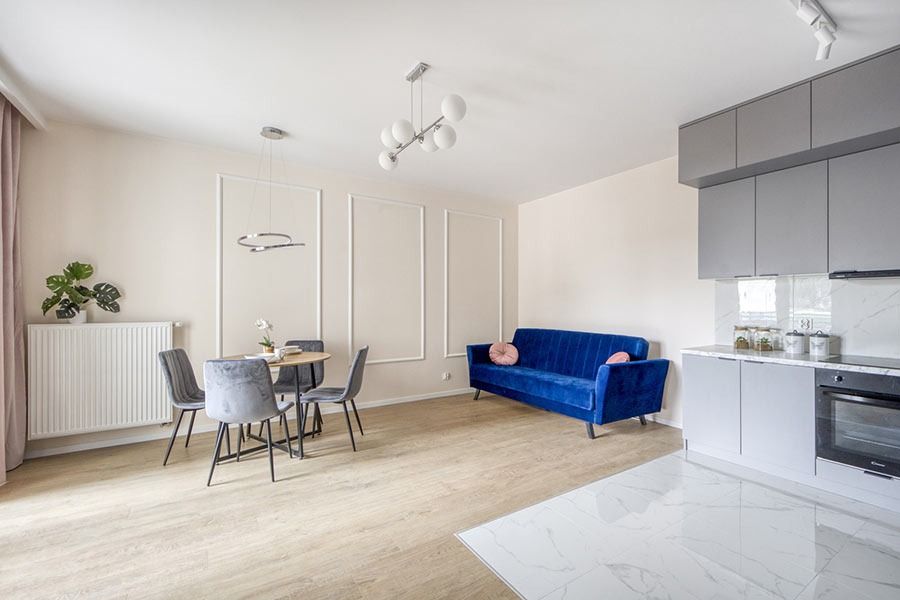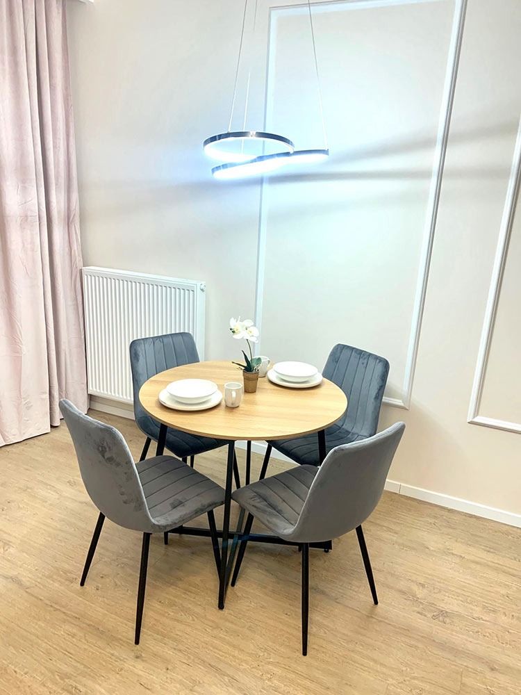 Mieszkanie zostało wykończone w bardzo wysokim standardzie. Podczas prac wykonano zabudowy z GK, szpachlowanie i gipsowanie, ułożono wysokiej jakości gres na podłodze w korytarzu i aneksie kuchennym oraz panele w części dziennej i w sypialni. W kuchni znajdują się wykonane na wymiar meble kuchenne. W zabudowie znajduje się sprzęt AGD: lodówka, zmywarka, piekarnik, płyta indukcyjna oraz okap podszafkowy. W łazience położno gres i glazurę, wykonano kabinę prysznicową z odpływem walk-in, jak również zabudowy meblowe na wymiar. Na ścianie w salonie znajduje się sztukateria. W lokalu znajdują się drzwi zewnętrze, antywłamaniowe. Zamontowano także oświetlenie w technologii LED oraz listwy przypodłogowe. W korytarzu zamontowano wykonaną na wymiar podwójną szafę.