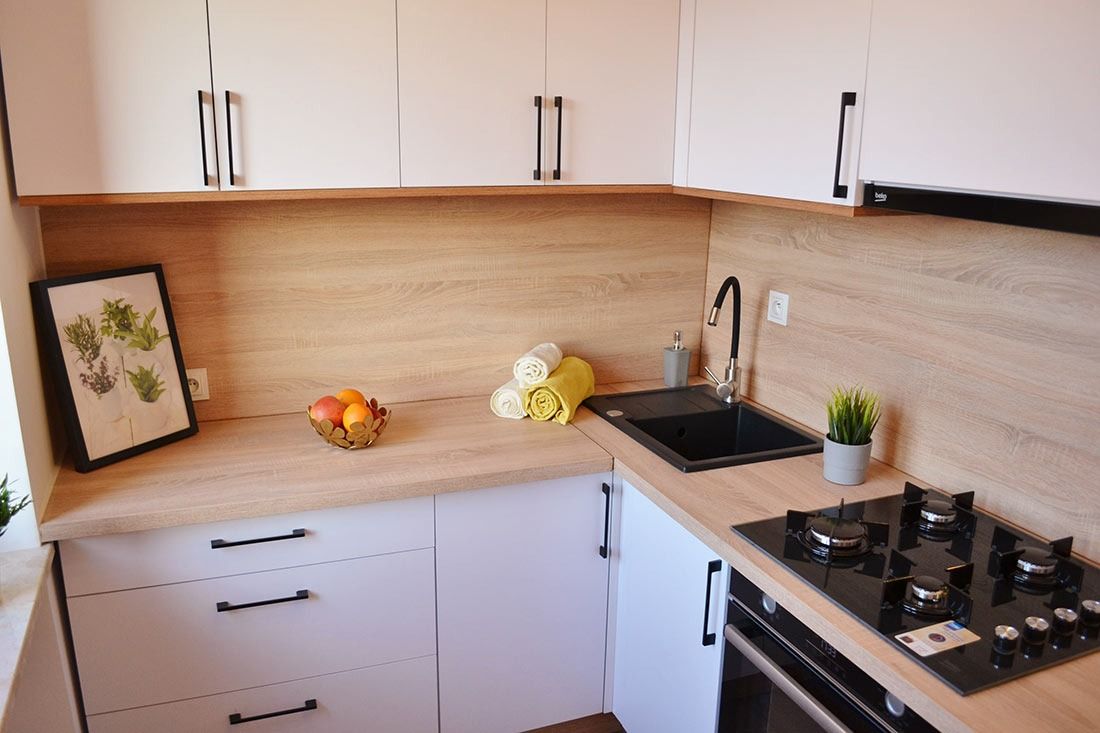 - nowe meble kuchenne, wykonane na wymiar przez zaprzyjaźnionego stolarza wraz z uchwytami Blum. Ponadto w kuchni zamontowano nowy sprzęt AGD firmy Beko -piekarnik elektryczny, płytę gazową oraz okap podszafkowy. Przygotowano również miejsce na pralkę do zabudowy.