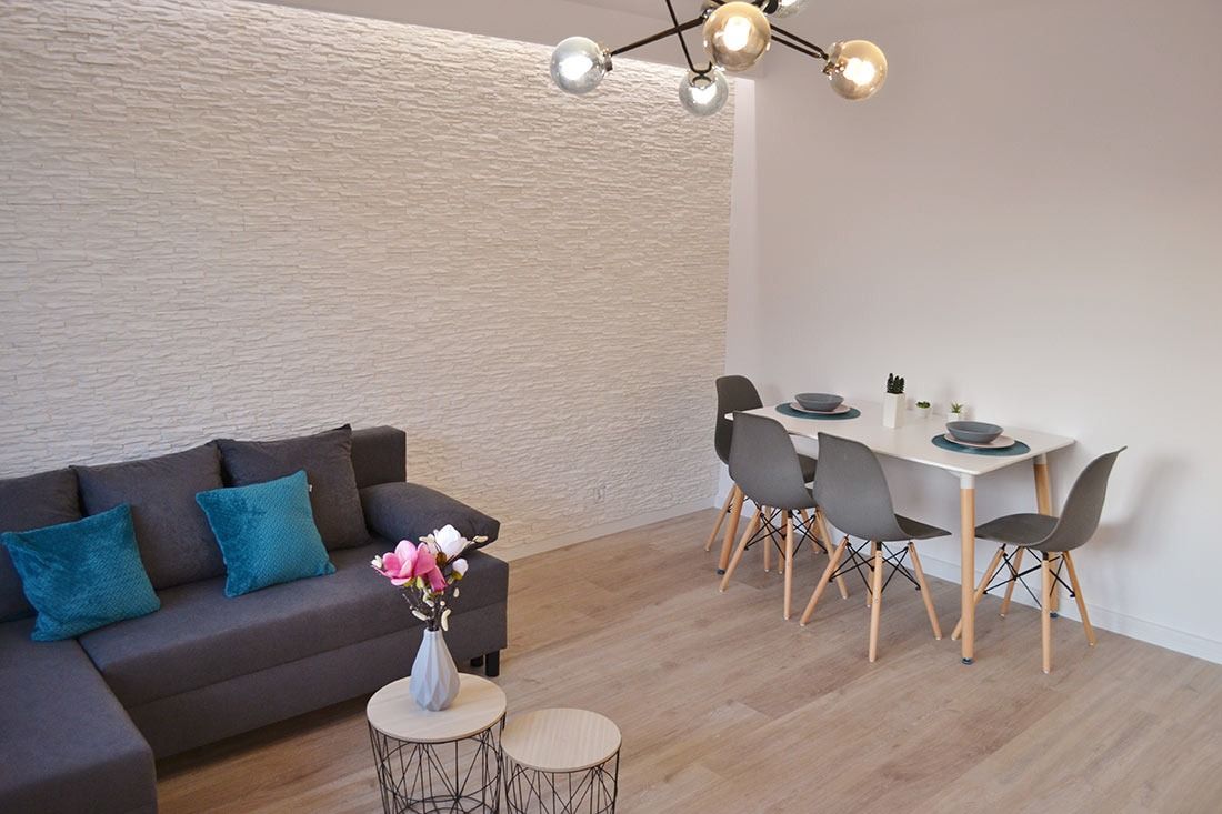 - nowa ścianka z płytek dekoracyjnych w salonie