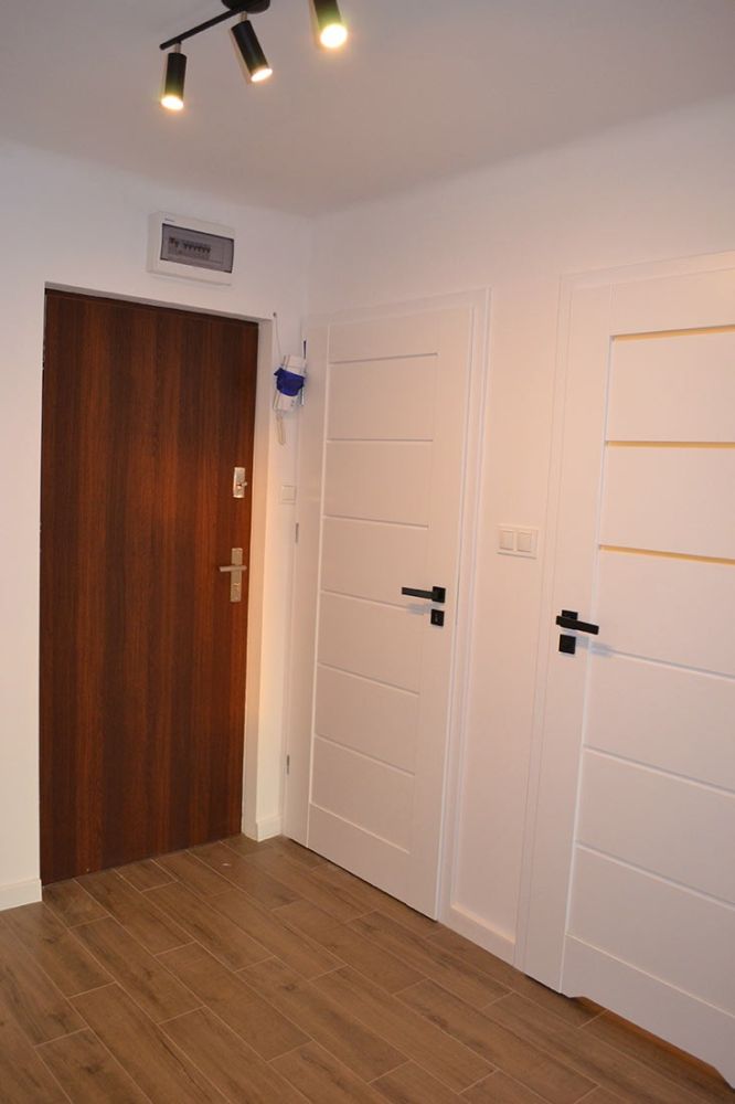 - nowe drzwi zewnętrzne, dźwiękochłonne oraz drzwi w pokojach