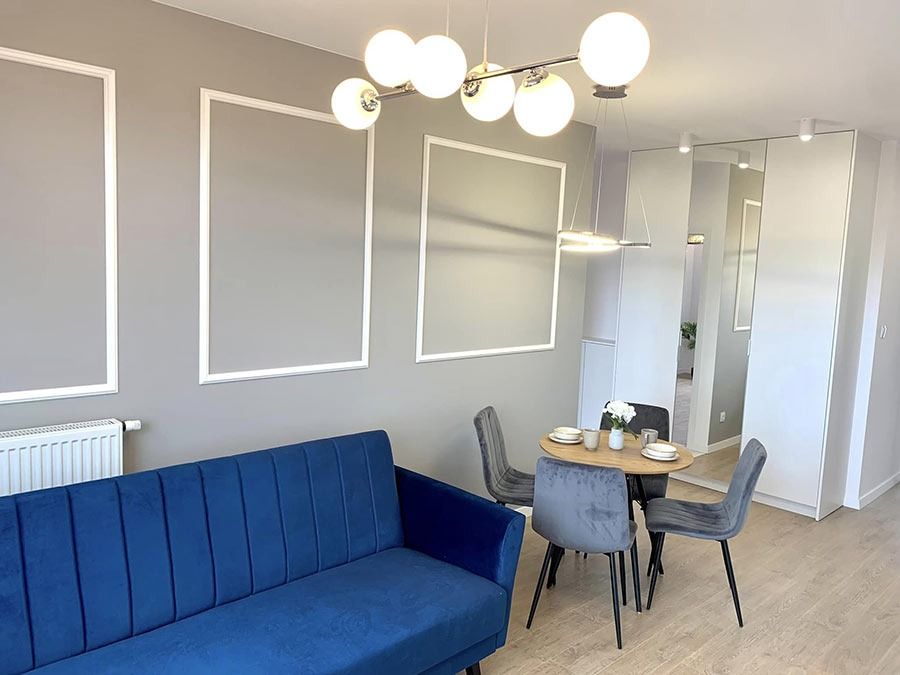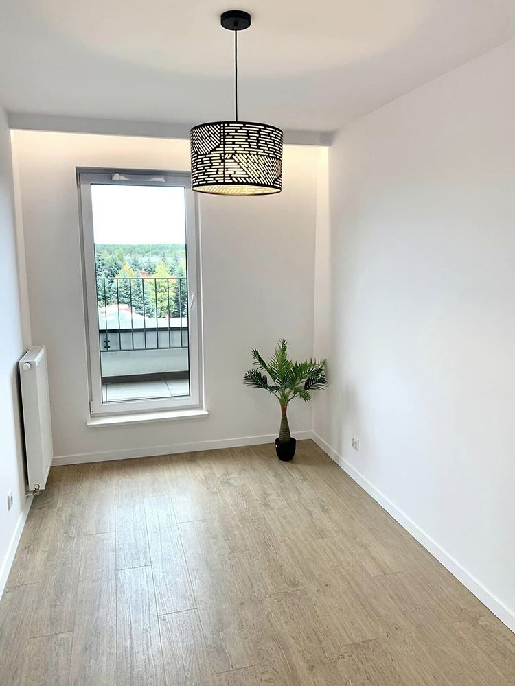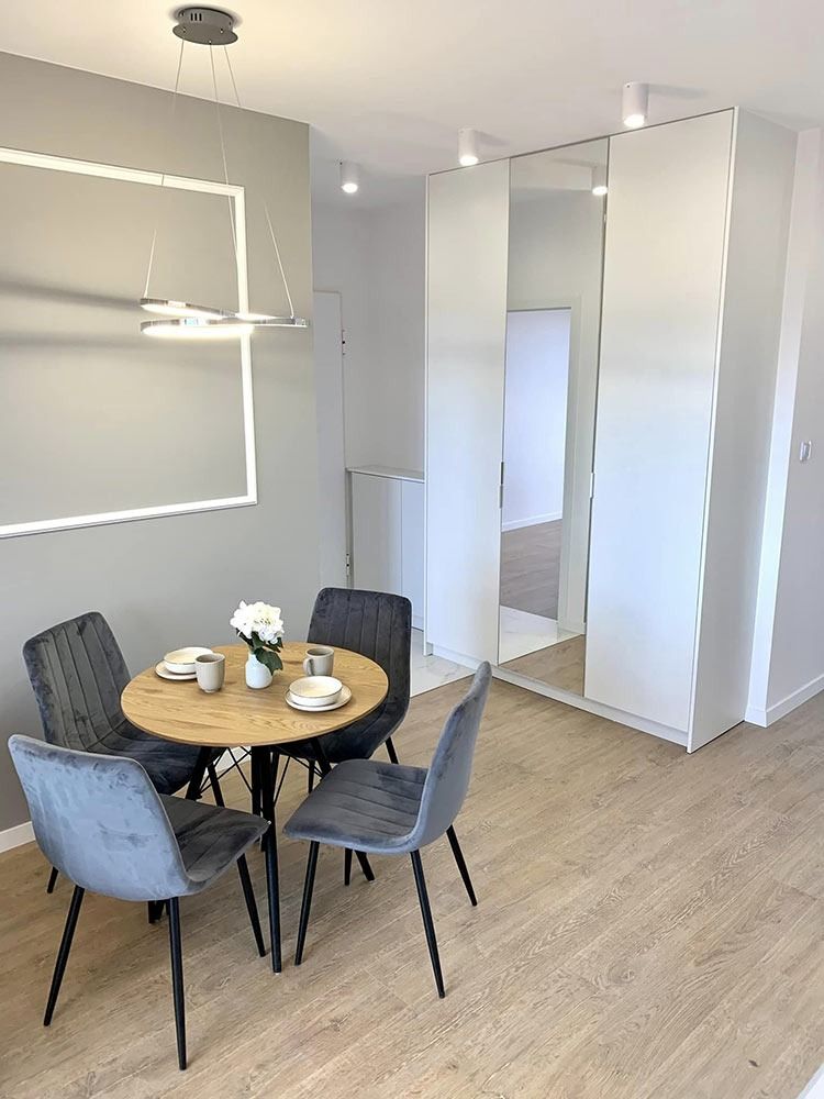 Mieszkanie zlokalizowane jest na 4 piętrze i pochodzi z zasobów nowo powstającego, eleganckiego osiedla realizowanego przez dewelopera SP Invest. Lokal został wykończony w wysokim standardzie. Ułożono gres oraz glazurę, wykonano szpachlowanie i gipsowania oraz zabudowy GK. W kuchni, łazience i korytarzu wykonano meble na wymiar, w których znajduje się pełen zestaw sprzętu AGD. W całym mieszkaniu oświetlenie w technologii LED. Na ścianie znajduje się sztukateria.